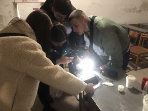 (на фото практичне заняття в укритті з дисципліни “Фотожурналістика”, Zh1-B21 група вивчає предметну зйомку)